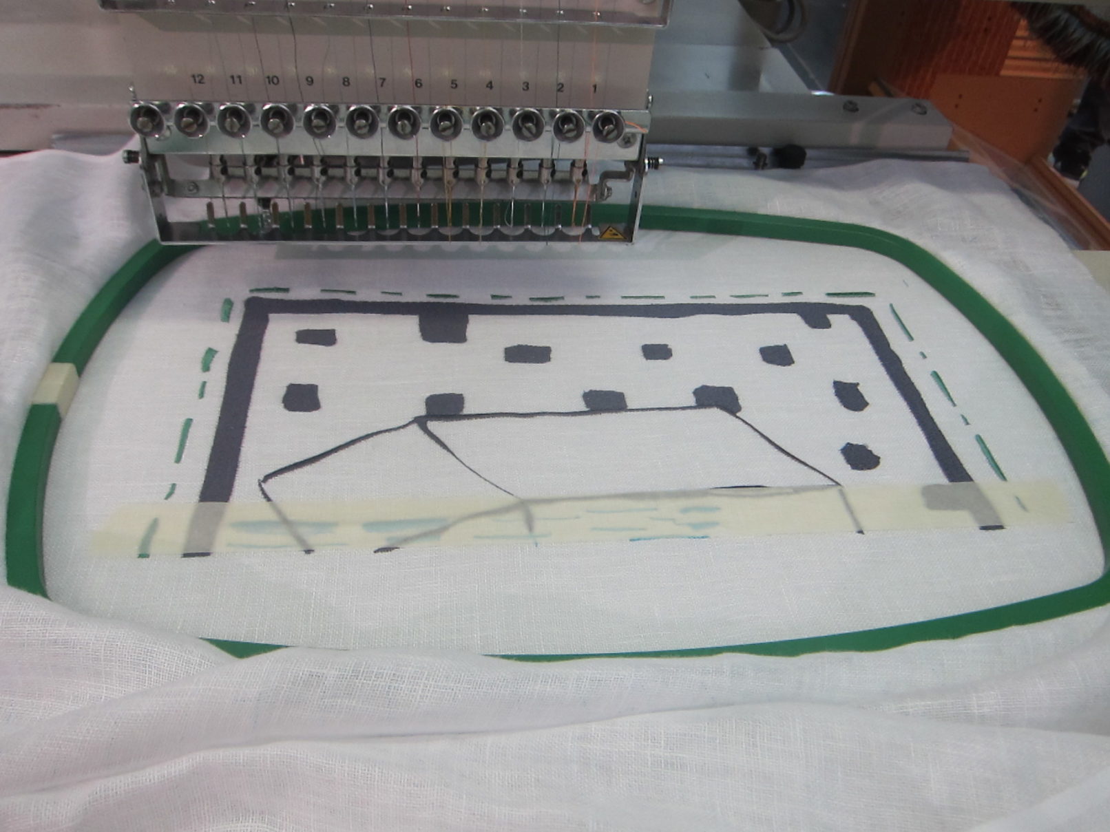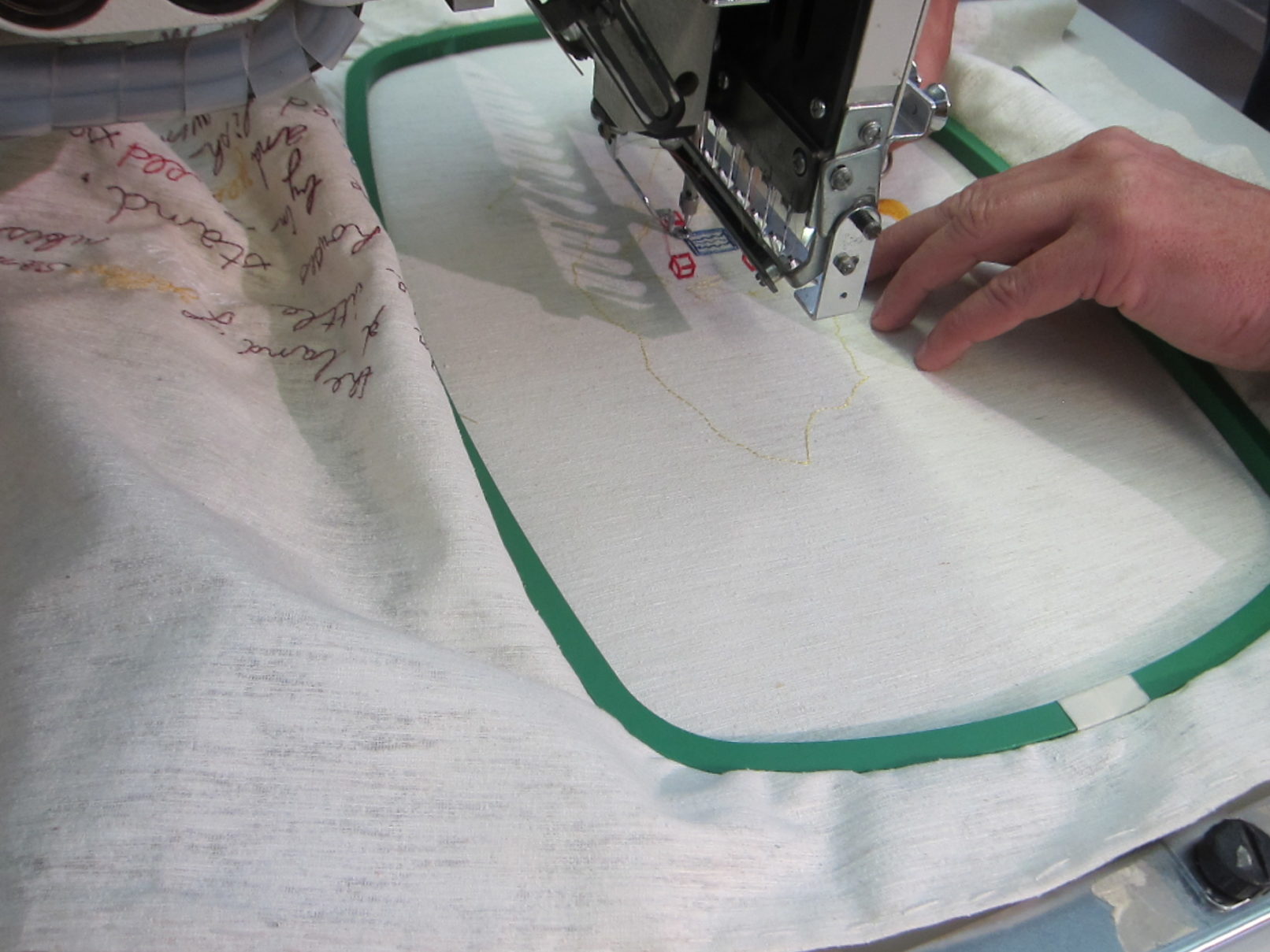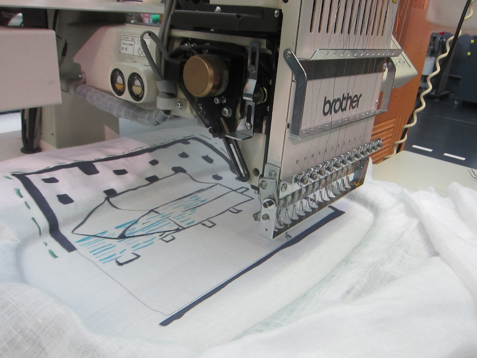 Working in the textile lab in Tilburg had this quality of working on one textile piece over a longer period of time. I was interested in how the machine would change my images. The slowness of the process enabled me to take a distance to my own work. Every step and decision in the process was equally important: writing the application, communication with Frank de Wind about my project, making the sketches, choosing the textiles, choosing the colours for the thread and working together with Frank de Wind for many days at the textile lab.