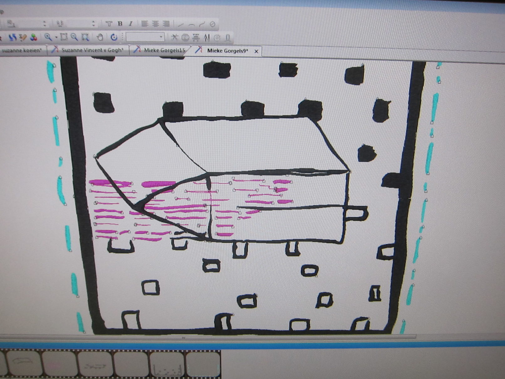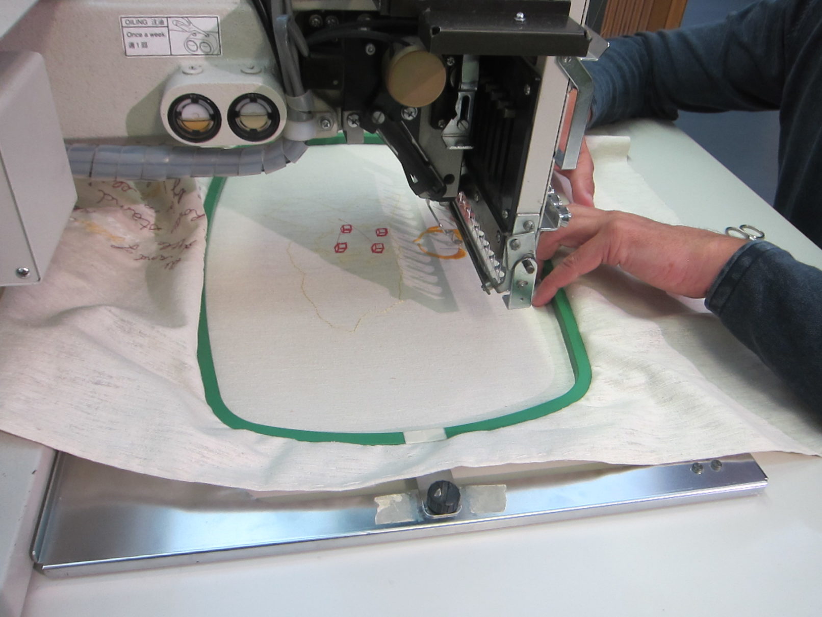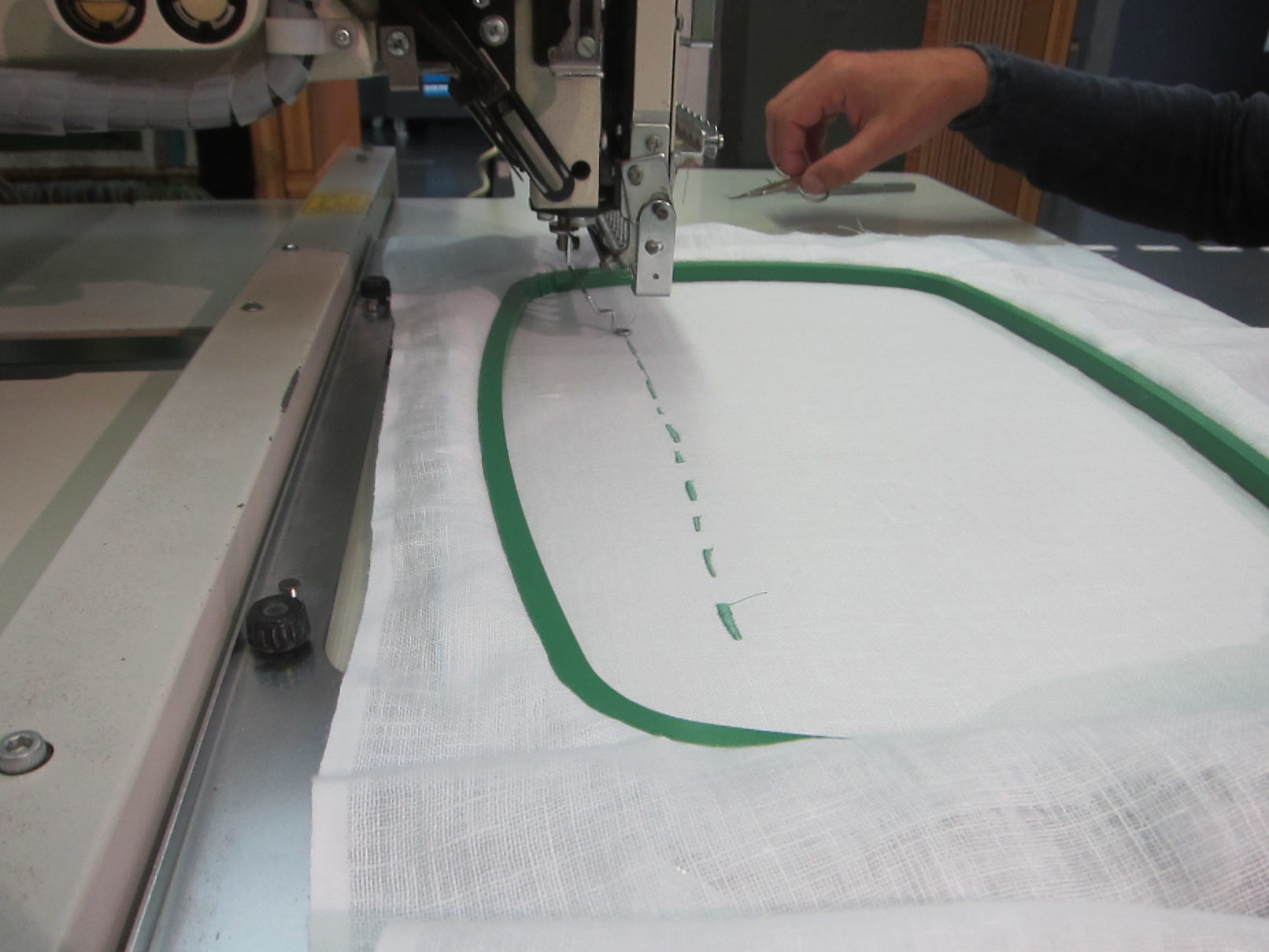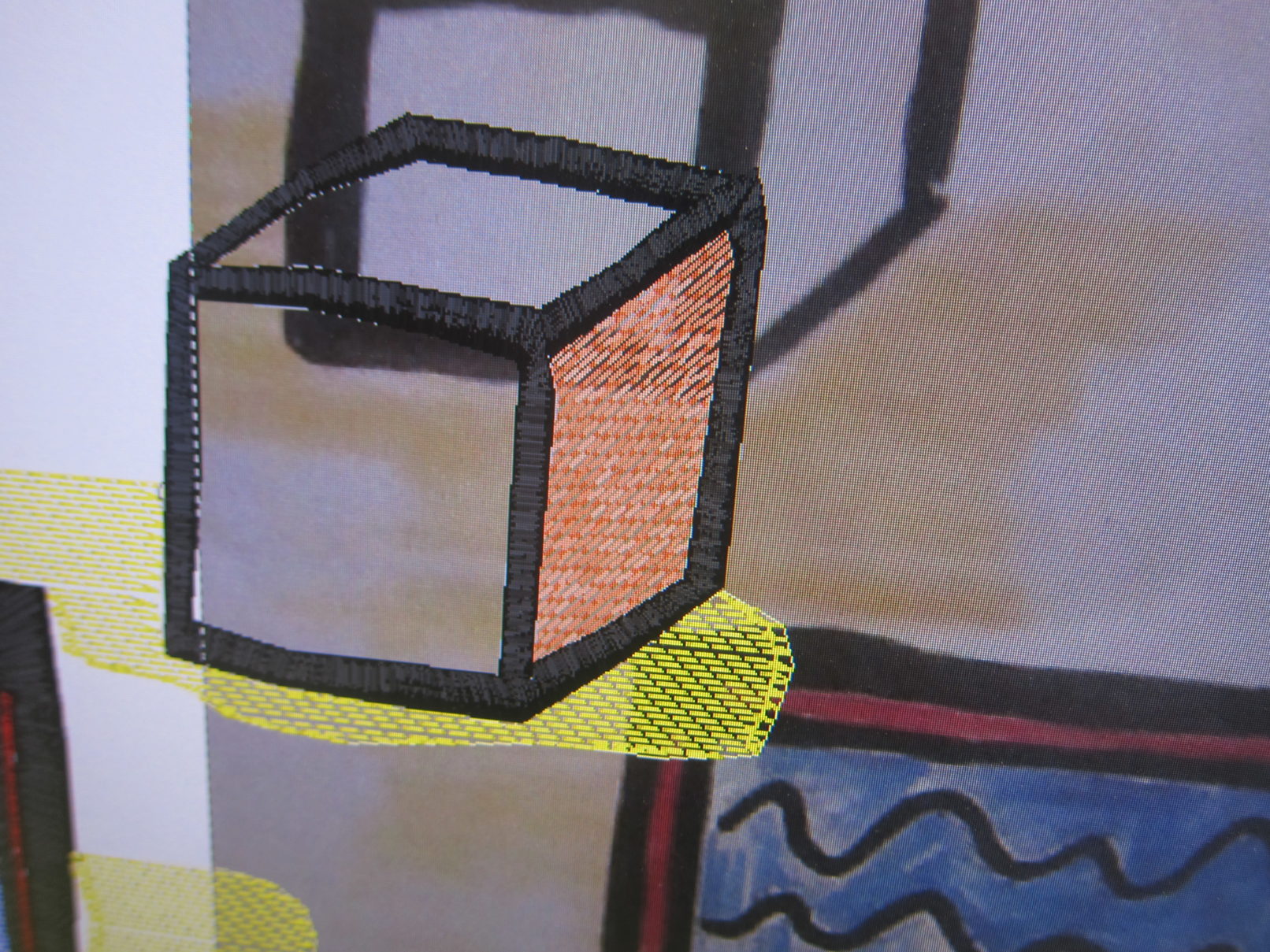 Working in the textile lab in Tilburg had this quality of working on one textile piece over a longer period of time. I was interested in how the machine would change my images. The slowness of the process enabled me to take a distance to my own work. Every step and decision in the process was equally important: writing the application, communication with Frank de Wind about my project, making the sketches, choosing the textiles, choosing the colours for the thread and working together with Frank de Wind for many days at the textile lab.